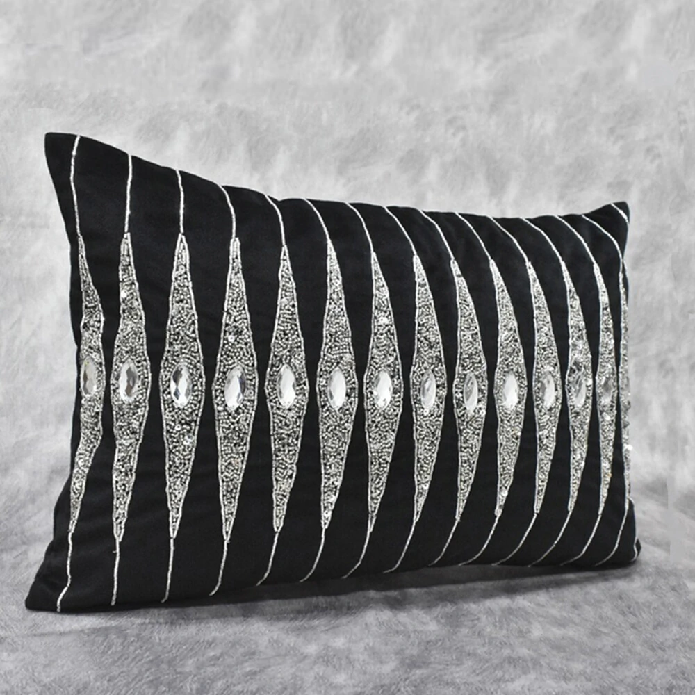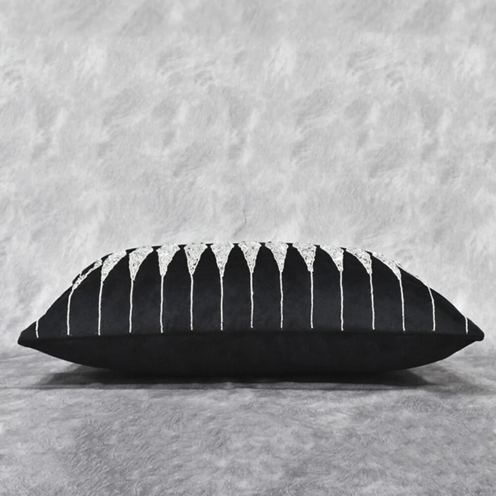 A decoração é composta por um padrão geométrico de losangos alongados, dispostos verticalmente e em fileiras, que cobrem toda a superfície frontal da almofada. Cada um desses losangos é bordado a mão por uma miríade de vidrilhos, miçangas e cristais minúsculos e brilhantes em tom de prata. Essa profusão de materiais cria uma textura cintilante e um brilho suave, que contrasta lindamente com o fundo preto. Trabalhadas em um degradê sutil, com os cristais sendo mais densos e mais brilhantes no centro dos losangos.