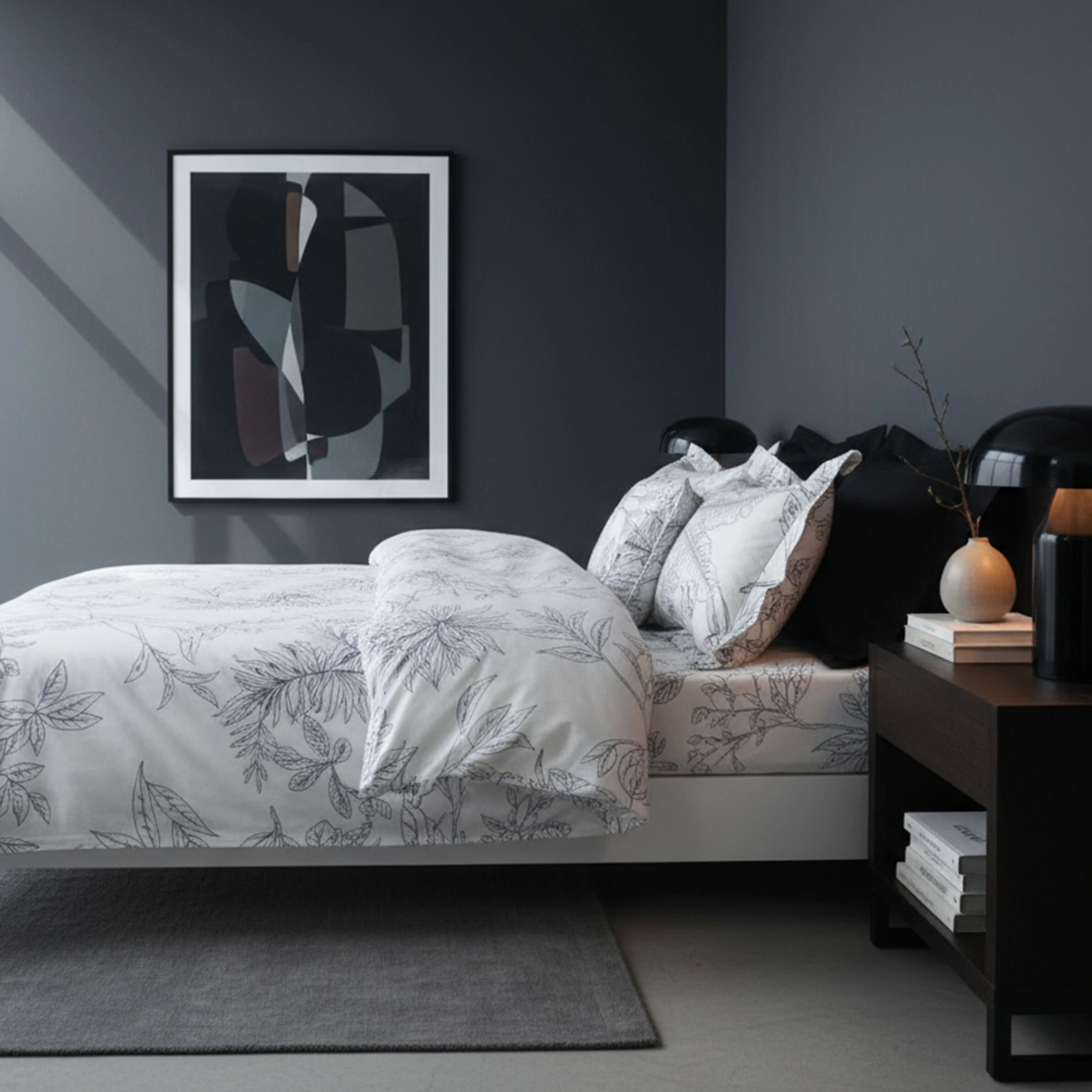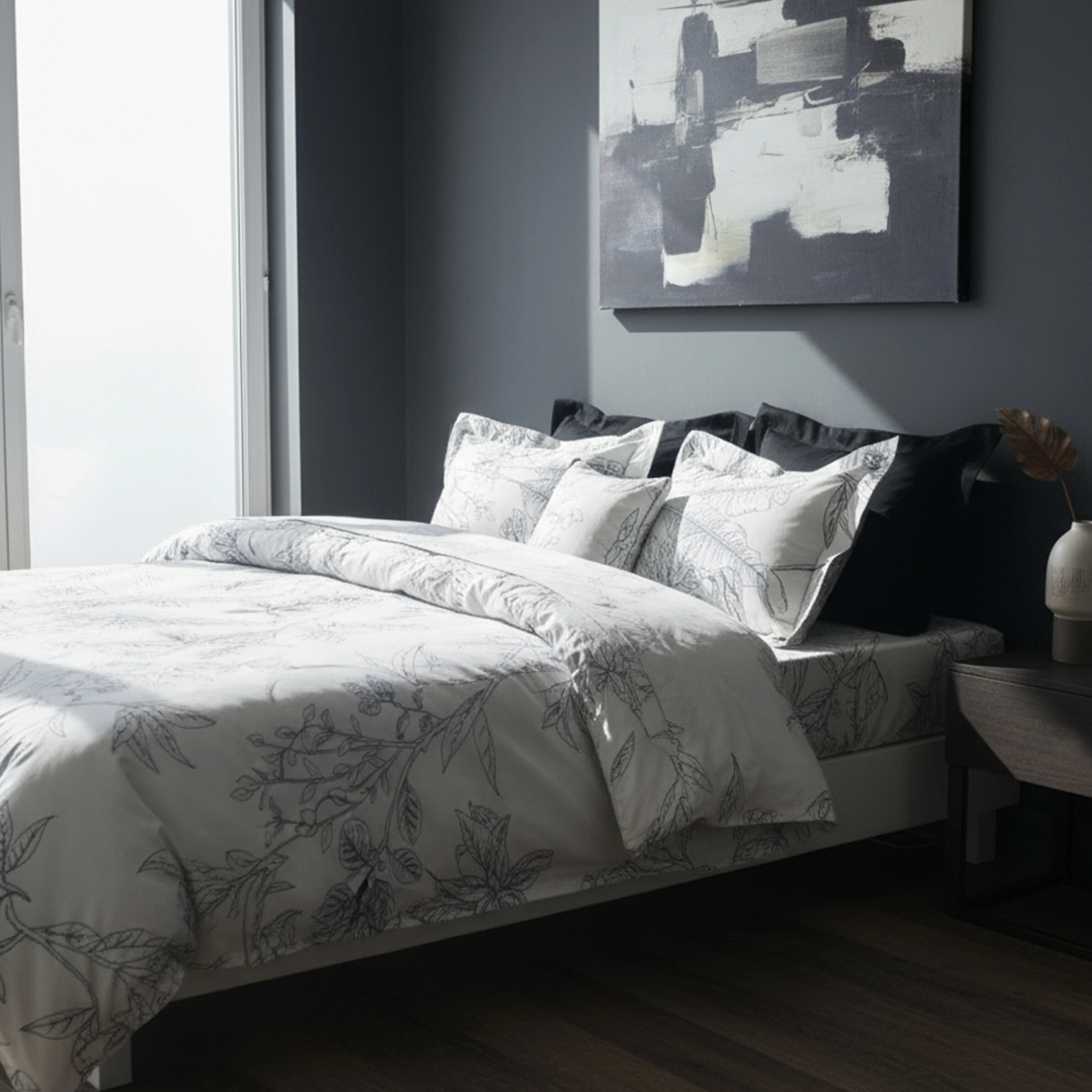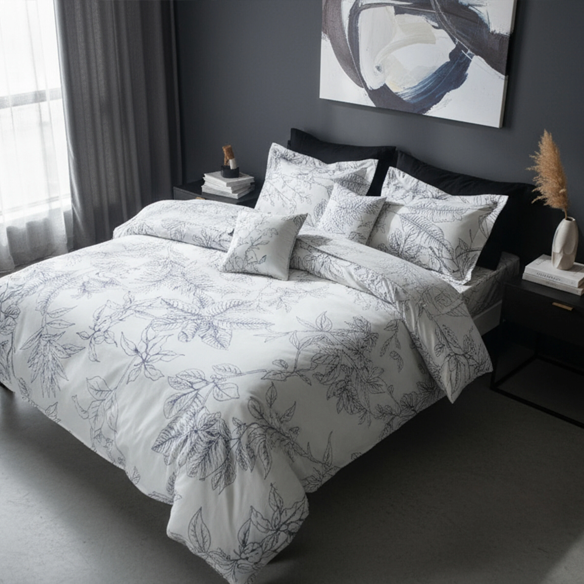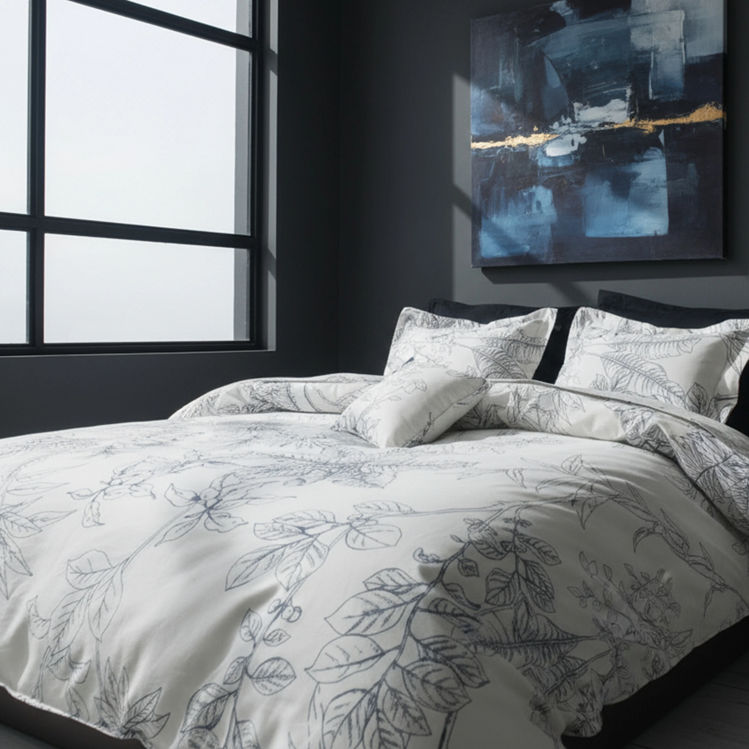A estampa florestal, em um delicado tom de cinza grafite, é formada por traços finos e artísticos. Galhos e folhas são desenhados com precisão, criando um visual que não é nem pesado nem sobrecarregado, adicionando um toque de vida e movimento ao decor. É uma estampa que transforma o quarto em um refúgio de paz, com uma estética minimalista e sofisticada.