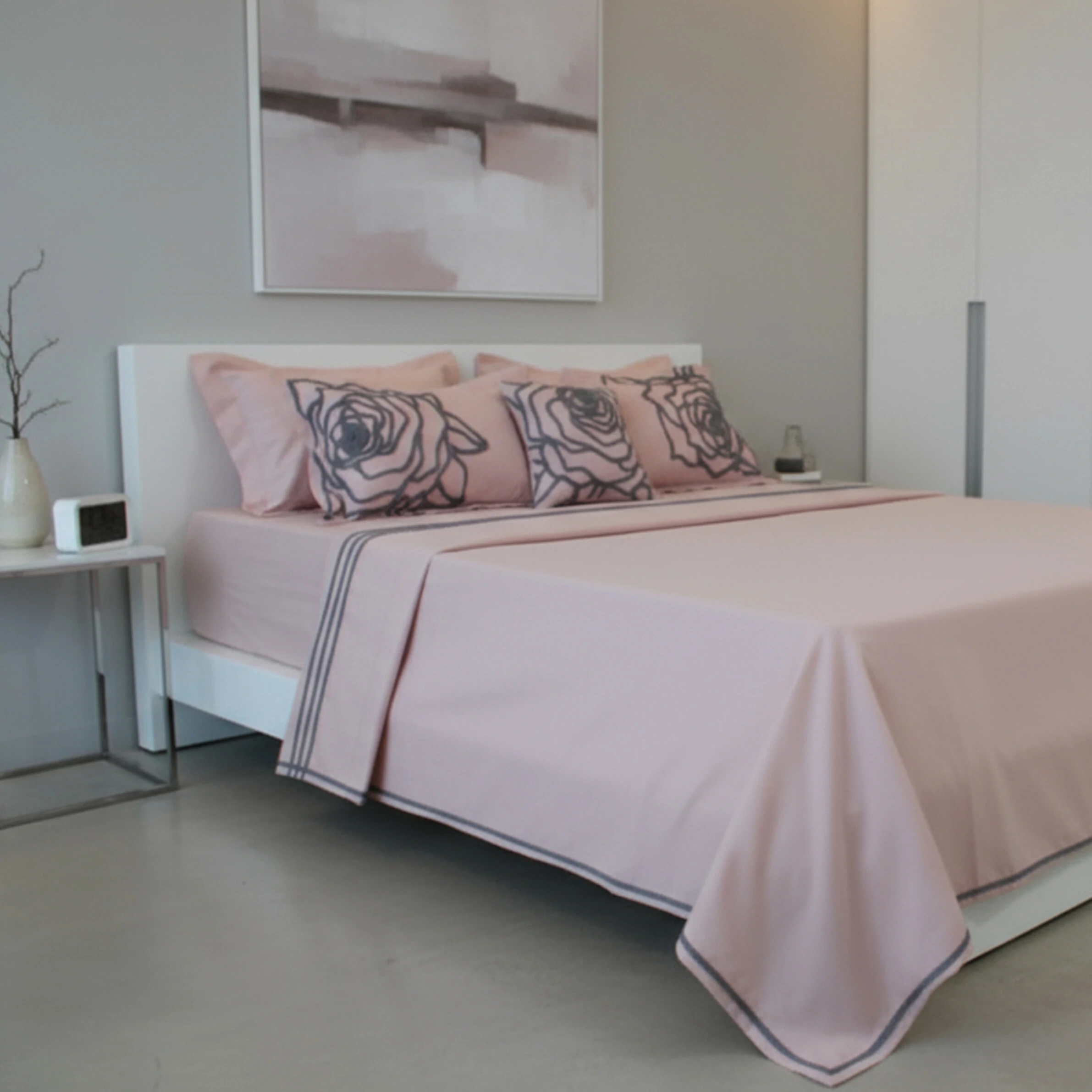 1 Lençol de Cima: Em algodão 200 fios na cor rose, este lençol de cima é adornado com detalhes bordados nas bordas e no vira. Esse toque sutil de artesanato eleva a peça, permitindo que os detalhes bordados do vira fiquem a mostra em todo momento durante o uso.