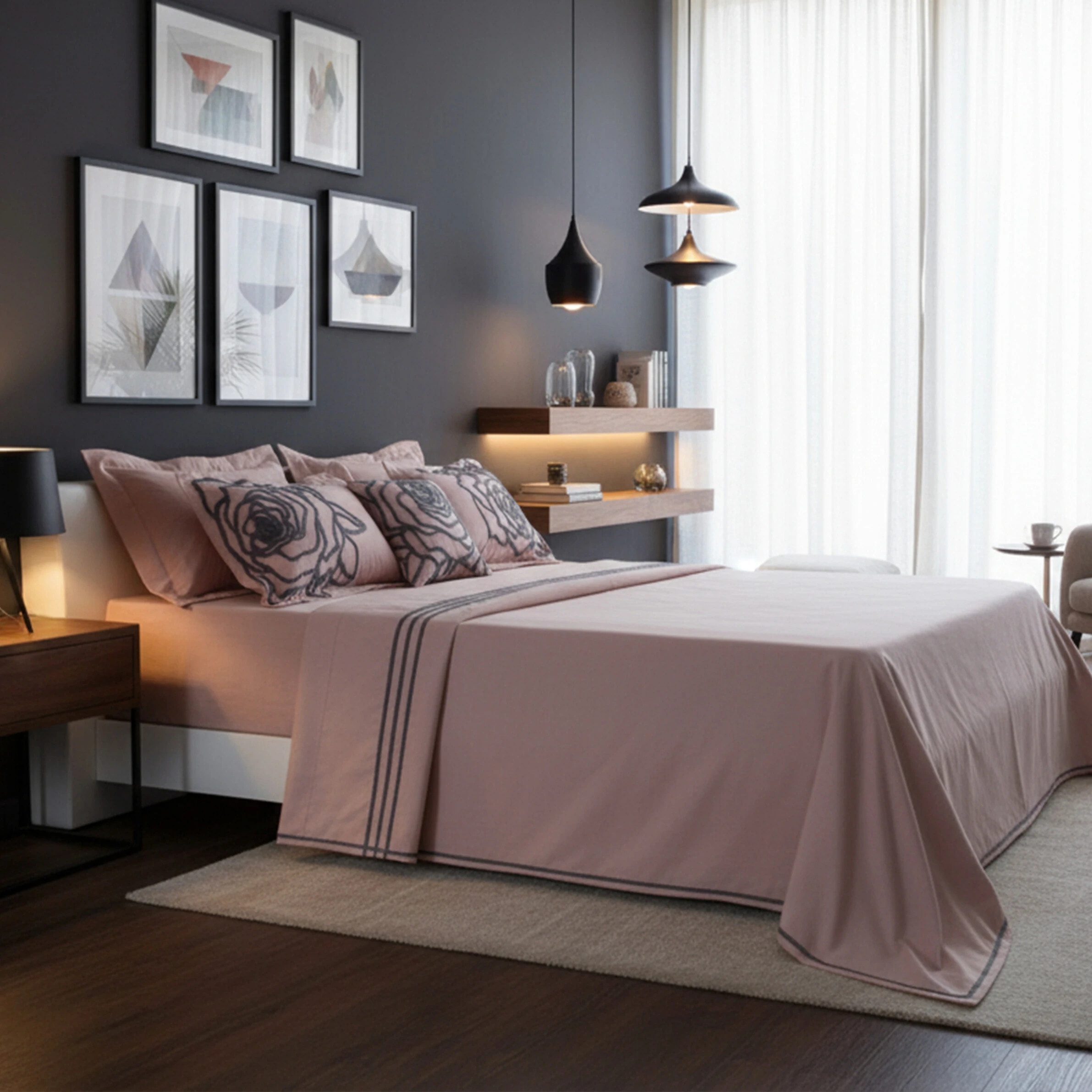 Cada componente deste jogo de cama foi cuidadosamente desenhado para harmonizar perfeitamente. A combinação da textura suave do algodão, a cor rose calmante e os bordados florais meticulosamente executados cria uma atmosfera de requinte e aconchego.