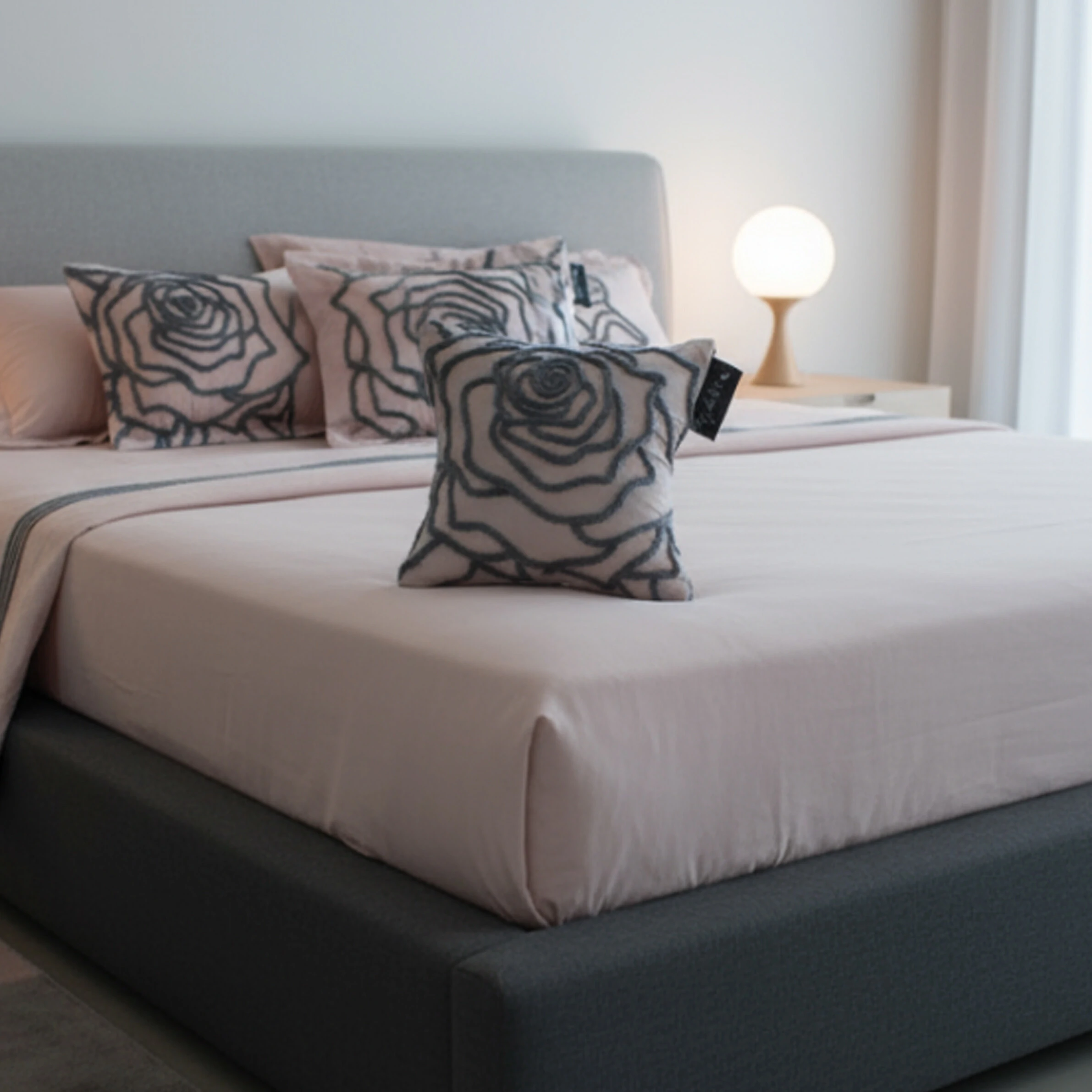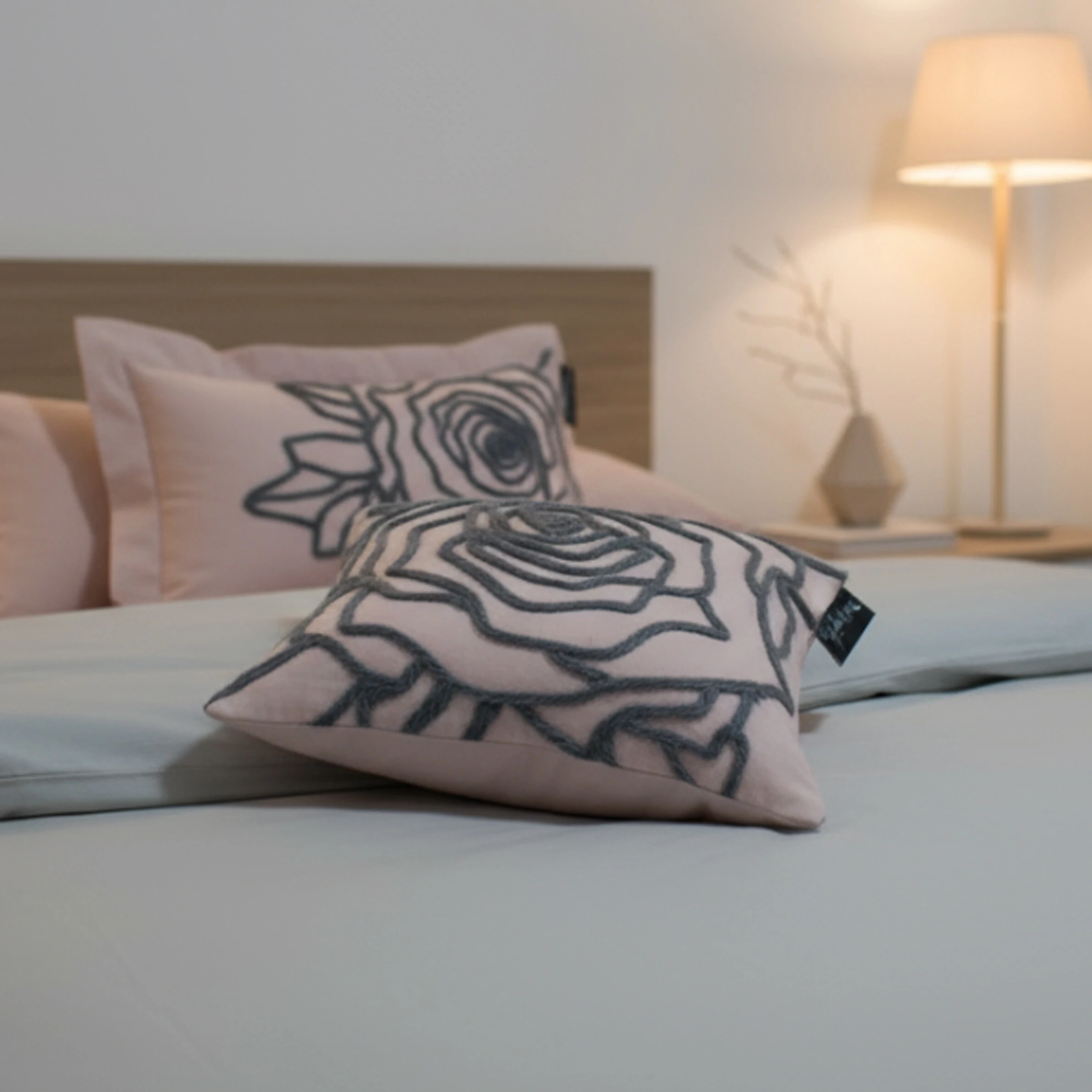 A almofada Roses se destaca por sua elegância discreta e seu toque de sofisticação. Confeccionada em algodão 200 fios, ela apresenta uma base de cor rose, um tom de rosa bem suave e sutil.