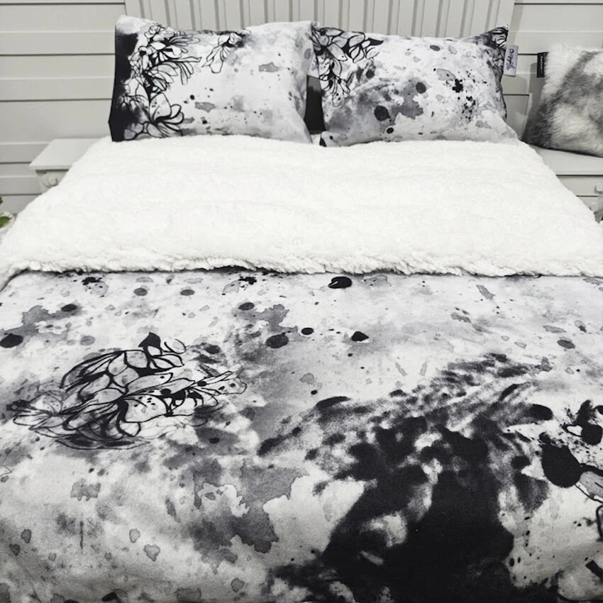 O design é uma fusão de manchas orgânicas, que se espalham de forma fluida pela superfície, e contornos florais delicados, desenhados em preto, que parecem emergir do fundo. A mistura de pinceladas fortes e respingos de tinta escura com o branco limpo cria um contraste dramático e elegante, conferindo à peça uma aparência moderna e até mesmo um pouco urbana. É um padrão que evoca a sensação de movimento e expressão artística, transformando o cobertor em uma verdadeira obra de arte para o quarto.