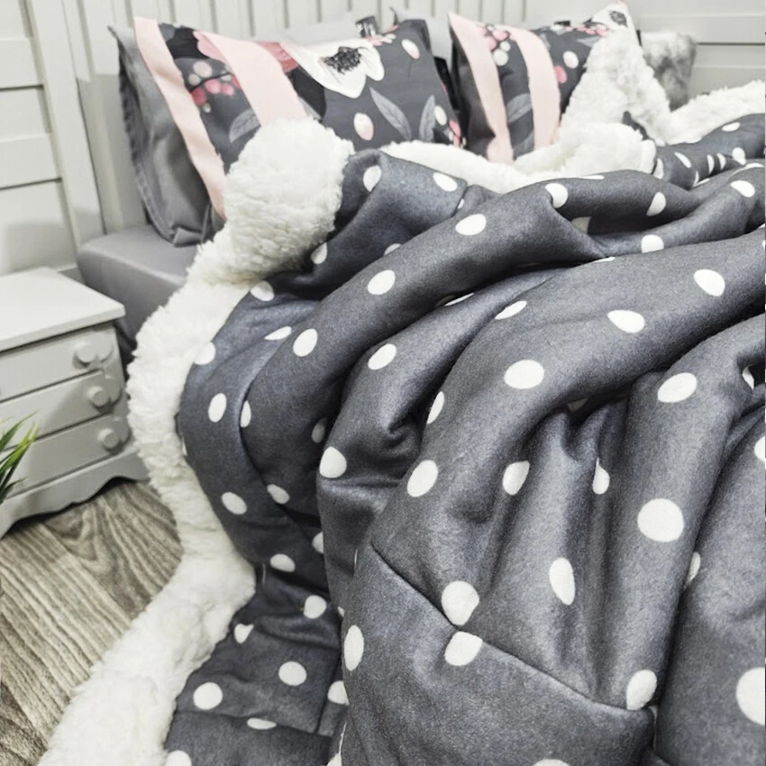 Este cobertor é uma fusão encantadora de um design clássico e aconchego moderno, perfeito para adicionar um toque de doçura e conforto a qualquer ambiente. A face superior, o lado que se destaca visualmente, apresenta um padrão de bolinhas (poá) off-white, de tamanhos variados, que se espalham de forma lúdica sobre um fundo cinza chumbo profundo. Esta combinação de cores é atemporal e versátil, remetendo a um estilo "pin-up" ou retrô, mas com uma sofisticação contemporânea. O padrão de bolinhas confere à peça uma sensação de alegria e leveza, enquanto o tom de cinza sólido garante que ela se integre facilmente em diferentes decorações.